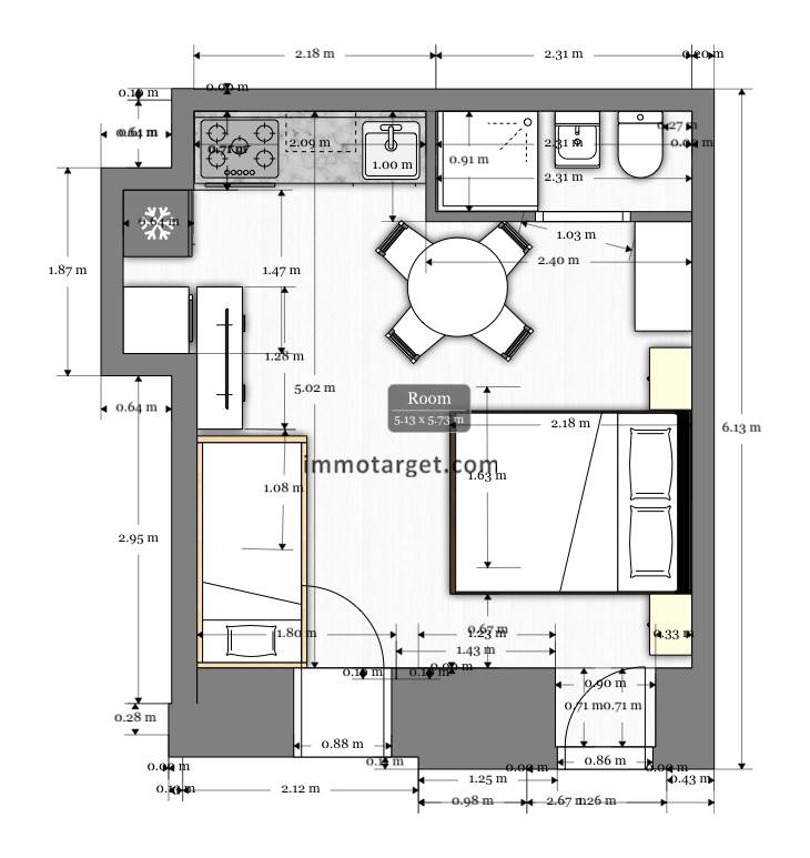 Optimale Fläche für ein funktionelles Studio-Apartment.
